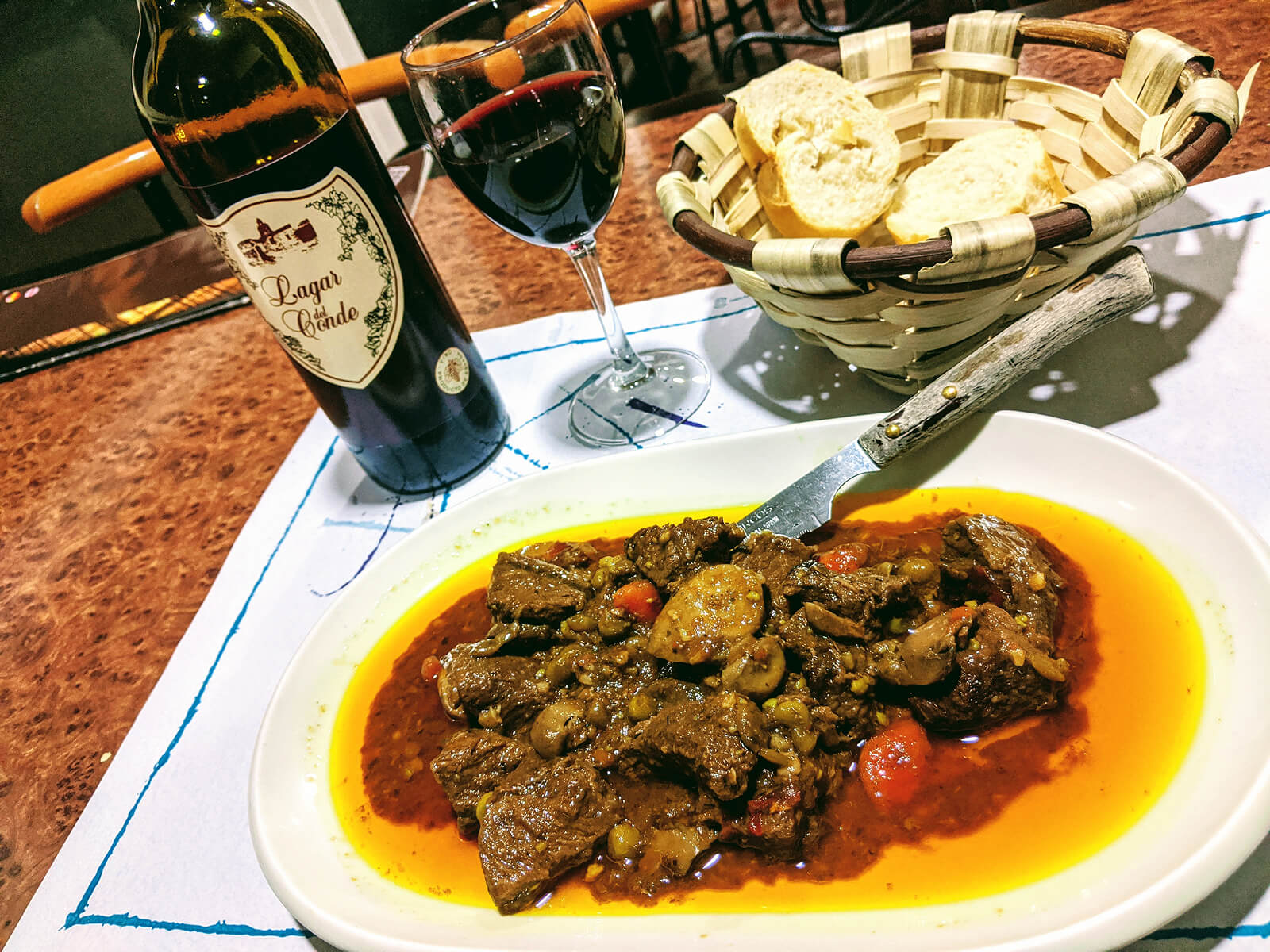 西班牙的晚餐通常八點後才開始,而這家餐廳完全超出預期。鮮濃的海鮮蛤蜊魚湯,燉得入味的牛肉搭配紅酒,還有一道獨特的米布丁作為結尾。每一道都讓人想把胃袋再撐大一點。也學著當地人把麵包撕開,沾著湯汁吃,樸實卻極致美味。