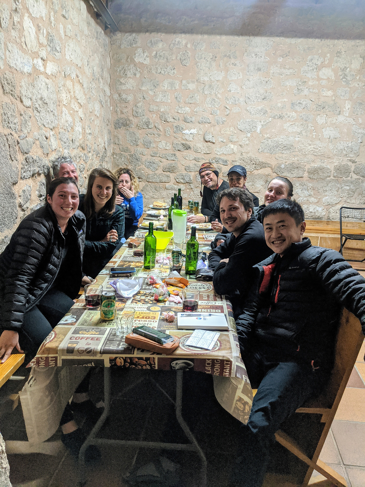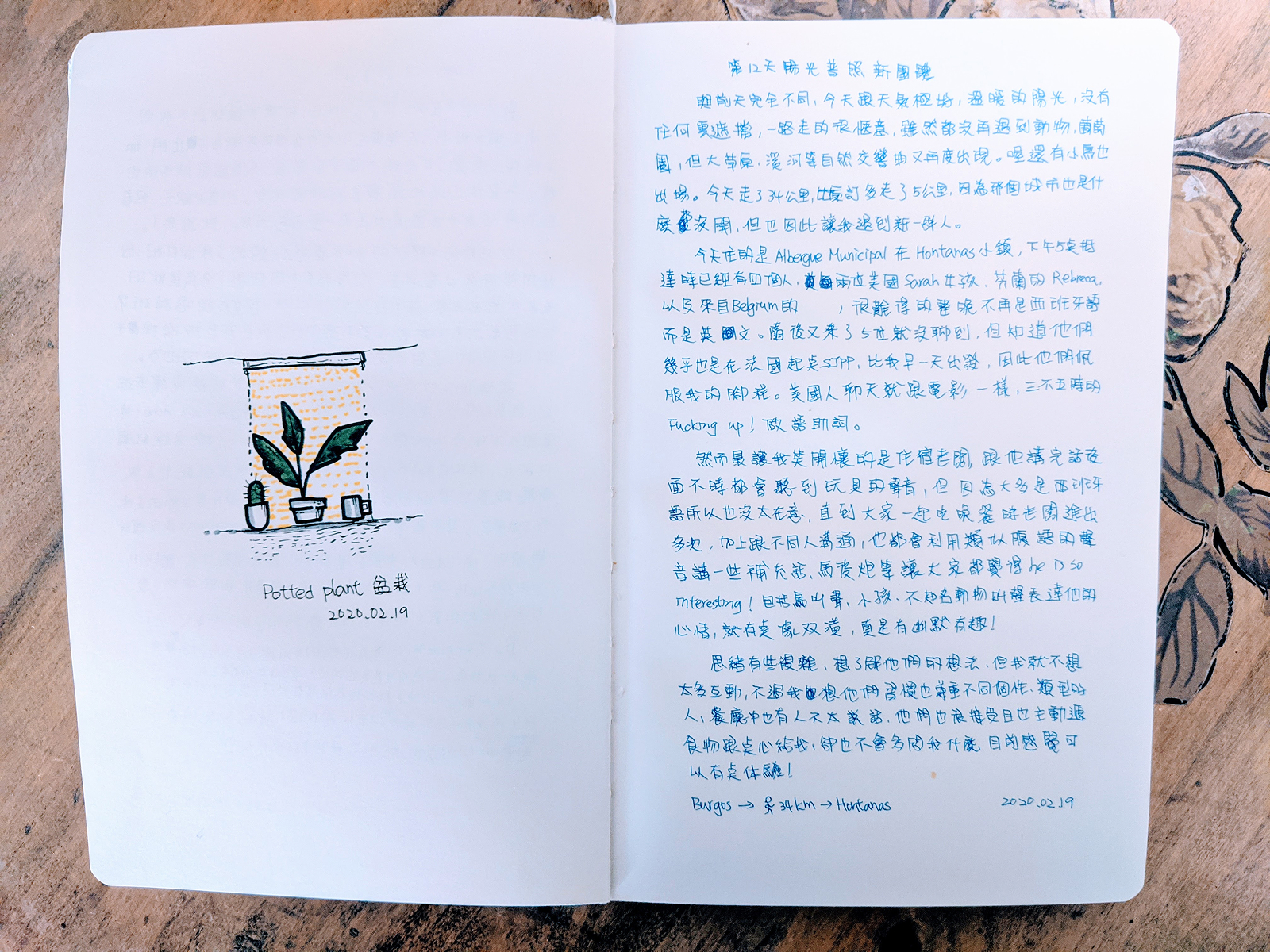 今晚住在 Hontanas 的 Albergue Municipal de Hontanas。下午五點抵達時,已經有四個人。兩位來自美國的女孩 Sarah,來自芬蘭的 Rebecca,還有一位比利時人。難得整晚幾乎都說英文,而不是西班牙文。後來又來了五位,雖然沒有太多交談,但知道他們幾乎都從 Saint-Jean-Pied-de-Port 出發,只比我早一天,因此對我的腳程感到驚訝。美國人聊天真的像電影裡一樣,語氣自然又誇張,三不五時冒出幾句語助詞,節奏鮮明。